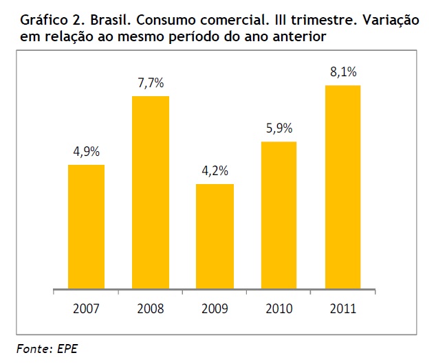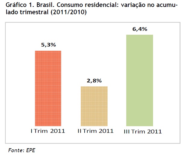 O Relatório Mensal do Mercado de Energia Elétrica mostra que de todos os trimestres de 2011, este último foi o que apresentou um maior crescimento do consumo residencial de energia (ver Gráfico 1). A EPE acredita que esse fato se explica pelo crédito difundido à população, as boas condições do mercado de trabalho e a taxa de desocupação, que declina a cada ano.