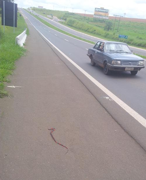 O tucano é uma ave linda. Encontrar um jogado na grama, provavelmente atingido por um caminhão, embrulha o estômago. O da foto foi avistado no final de uma subida, pertinho desta coral em que é possível ver até as marcas do pneu. Ela se arrastou até a beira do asfalto após ser atingida, mas, quando fotografada, estava estática, seca, dura. No trecho em questão, como em tantos outros, carros e caminhões passam sem nenhuma consideração por limites de velocidade ou respeito à vida.