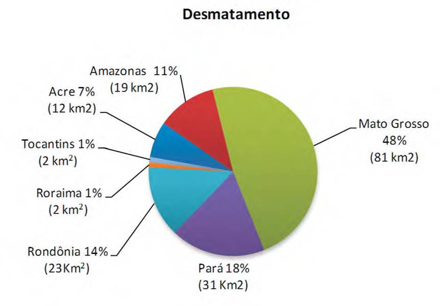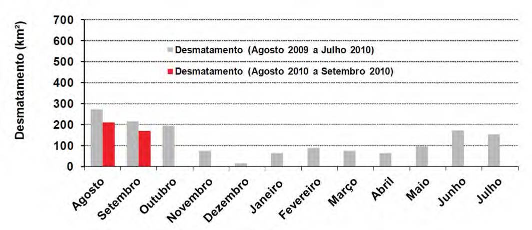fonte: ImazonUma comparação entre o acúmulo de degradação no período de agosto a setembro de 2010 com o mesmo período do ano anterior, demonstrou que houve um aumento expressivo de 213%, um aumento de 1398 quilômetros quadrados. A degradação florestal total do período em 2010 foi de 2055 quilômetros quadrados. Diferentemente do desmatamento – que representa o corte raso da floresta – a degradação demonstra a retirada seletiva de porções da mata.